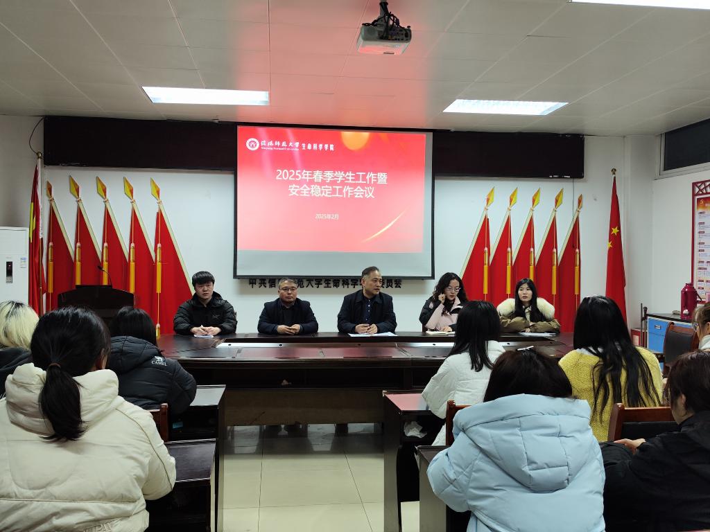 为确保2025年春季学期学生的安全,做好学期初的学生工作。2月27日,我院在生物楼412会议室召开2025年春季工作及安全稳定工作会议。我院党委书记李刚,副书记荣宪举,专职辅导员及学生会参加会议。