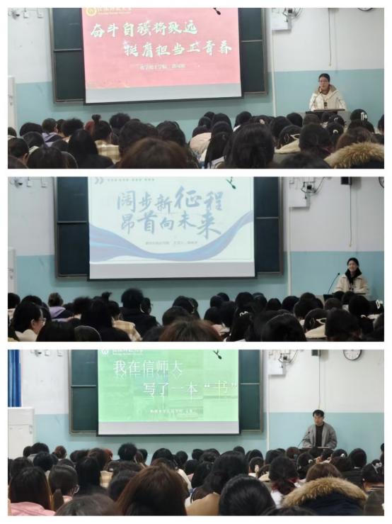 2021级专职辅导员张阳阳告诉同学们,奖学金不仅是对获奖同学努力的认可,也是对未获奖学生的一种激励,鼓励同学要向榜样学习,努力提升自己。然后化学化工学院郭可欣,数学与统计学院杨咏青,物理电子工程学院安哲依次上台进行宣讲。他们主要从思想、学习、科研、实践和技能拓展等方面进行讲解,在思想方面,向党靠拢,坚定信仰;在学习方面,戒骄戒躁,谦逊好学;在科研方面,自主创新,不断探索;在实践方面,投身公益,乐于奉献;在技能拓展方面,广泛尝试,勤加练习。他们用亲身奋斗经历告诉同学们,要以榜样为灯塔,指引方向,勇于突破,超越自我,稳扎稳打地锤炼自己,做一个敢于创新,有理想信念的新时代青年。