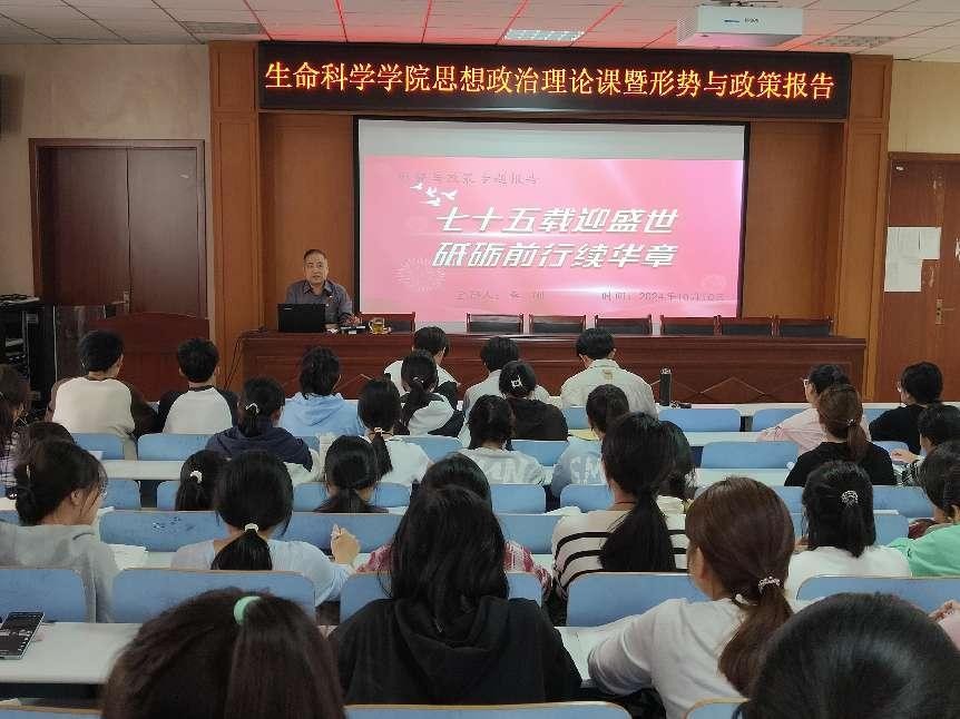 10月10日下午,学院党委书记李刚副教授走进思政课课堂,为2023级生物科学1班、2023级生物技术班及2023级茶学班的学生讲授题为“七十五载迎盛世 砥砺前行续华章”的思想政治理论课暨形势与政策报告。