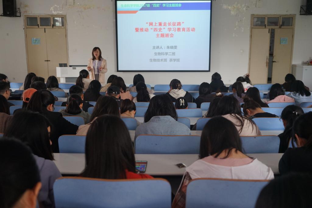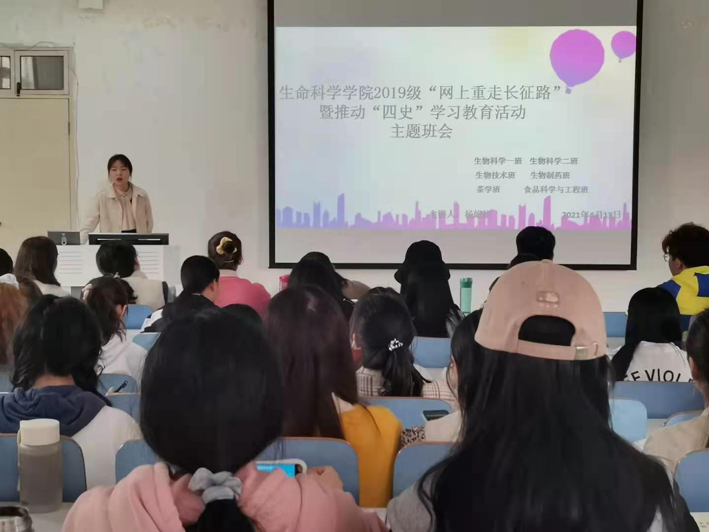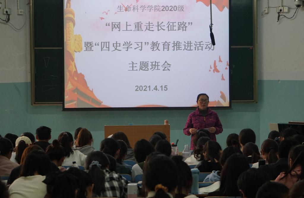 为深入学习贯彻习近平总书记关于学校党建和思政工作的重要指示批示精神,落实学校“网上重走长征路”暨推动“四史”学习教育活动有关要求,全面推进学生深入学好党史、新中国史、改革开放史、社会主义发展史,近日,我院各年级分别召开主题班会对“四史”学习教育再落实、再推进,班会由各年级辅导员孙太红、杨娟娟、朱晓雯、李敏主持。