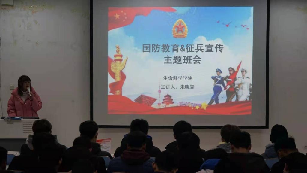 为增强学生的国防意识,培养学生的爱国情怀,1月4日晚6点,我院于生物楼414多媒体教室开展国防教育暨征兵宣传主题班会。班会由学院武装干事朱晓雯主持,我院全体男生参加了此次班会。