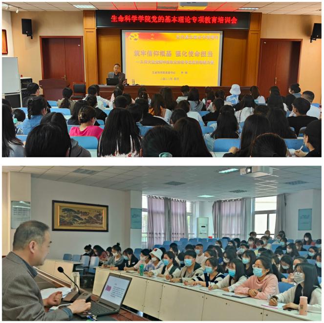 为确保师生党员对党的最新理论成果特别是党的指导思想认识到位,365英国上市党委于4月21日晚在生科楼414报告厅召开专题党课就党的基本理论进行专项教育培训。学院党委书记李刚以“筑牢信仰根基 强化使命担当——从伟大建党精神汲取党的指导思想的磅礴力量”为题,带领学生党支部书记和全体预备党员在重温革命故事、感悟信仰力量中对党的基本理论和指导思想进行再教育再培训。