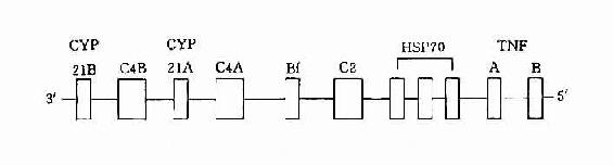 3.HLA-Ⅲ类基因HLA-Ⅲ类基因区域至少已发现36个基因座,其中C2、C4、Bf座编码相应的补体成分,另外还有21羧化酶基因(CYP21A、B)肿瘤坏死因子基因(TNFA、B)以及热休克蛋白70(heat shock protein70,HSP70)基因。补体C4由二个不同的基因(C4A与C4B)编码。HLA-Ⅲ类基因区结构见图5-3。